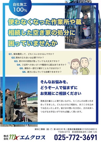 株式会社mxエムクロスは新潟県南魚沼市にある解体工事をメインにした建設会社です。